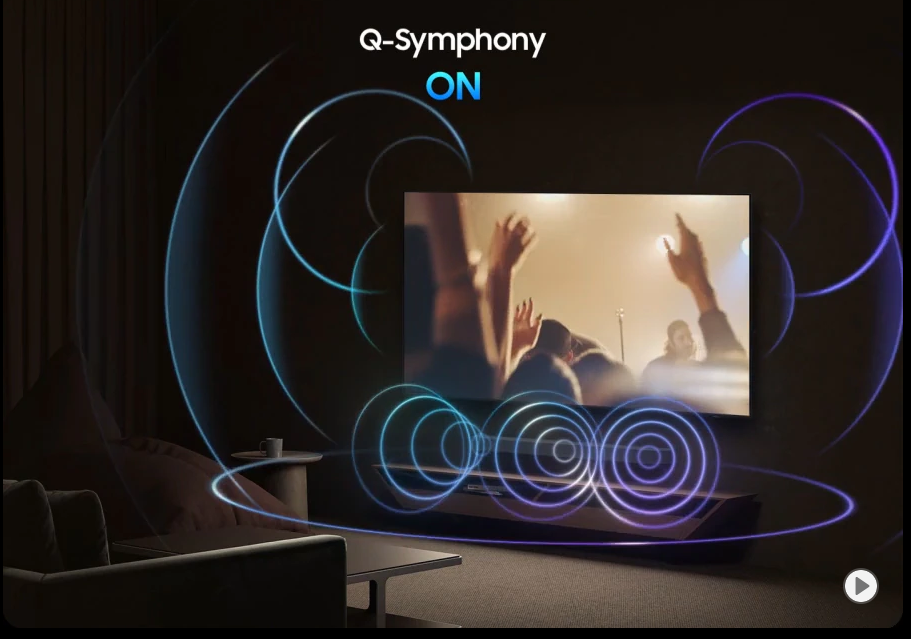 🎼 تلویزیون و ساندبار؛ هارمونی بینقص Q‑Symphony با فناوری انحصاری Q‑Symphony سامسونگ، صدای تلویزیون و ساندبار شما بهطور هماهنگ و همزمان نواخته میشود—بدون خاموش شدن هیچکدام از بلندگوها. نتیجه، صدایی فراگیر و منظم است که شما را در مرکز رویدادها قرار میدهد؛ از گفتوگوهای آرام گرفته تا انفجارهای هیجانانگیز، همهچیز با وضوح و عمق فوقالعاده شنیده میشود. | |