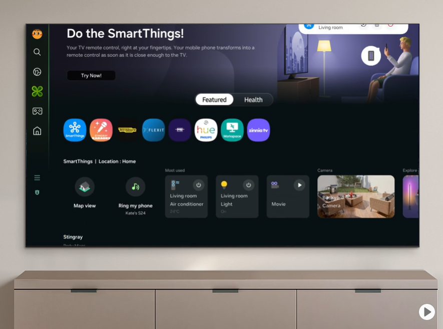دارای داشبورد هوشمند SmartThings برای مدیریت دستگاه ها، لوازم خانگی و خانه هوشمند از طریق تلویزیون