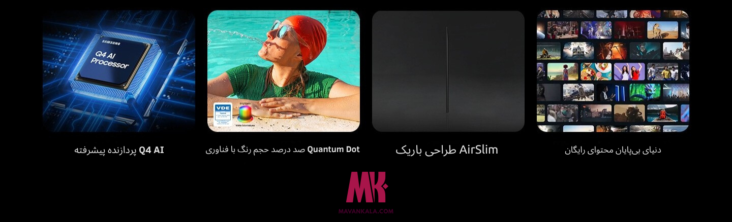 طراحی AirSlim – باریکتر و ظریفتر از همیشه ظرافت مدرن با فریم فوقباریک که در هر فضای داخلی، مینیمال و شیک دیده میشود؛ ترکیبی از زیبایی و کارایی در یک نگاه. ![]() | دنیایی بیپایان از محتوای رایگان با دسترسی به بیش از ۱۲۵+ کانال رایگان، هر روز برنامههای متنوع و سرگرمکننده را بدون هزینه، در خانهتان تماشا کنید. ![]() | حجم رنگ ۱۰۰٪ با فناوری Quantum Dot بیش از یک میلیارد سایه رنگ زنده و دقیق، همانطور که باید دیده شوند. هر تصویر با شفافیت و عمق واقعی، دنیای رنگها را بیانتها میکند.